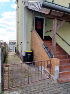 Das Haus besitzt eine Zufahrt zum Garten/Hof sowie zusätzlich eine Überdachung bzw. einen großen Carport sowie einen Geräteschuppen.